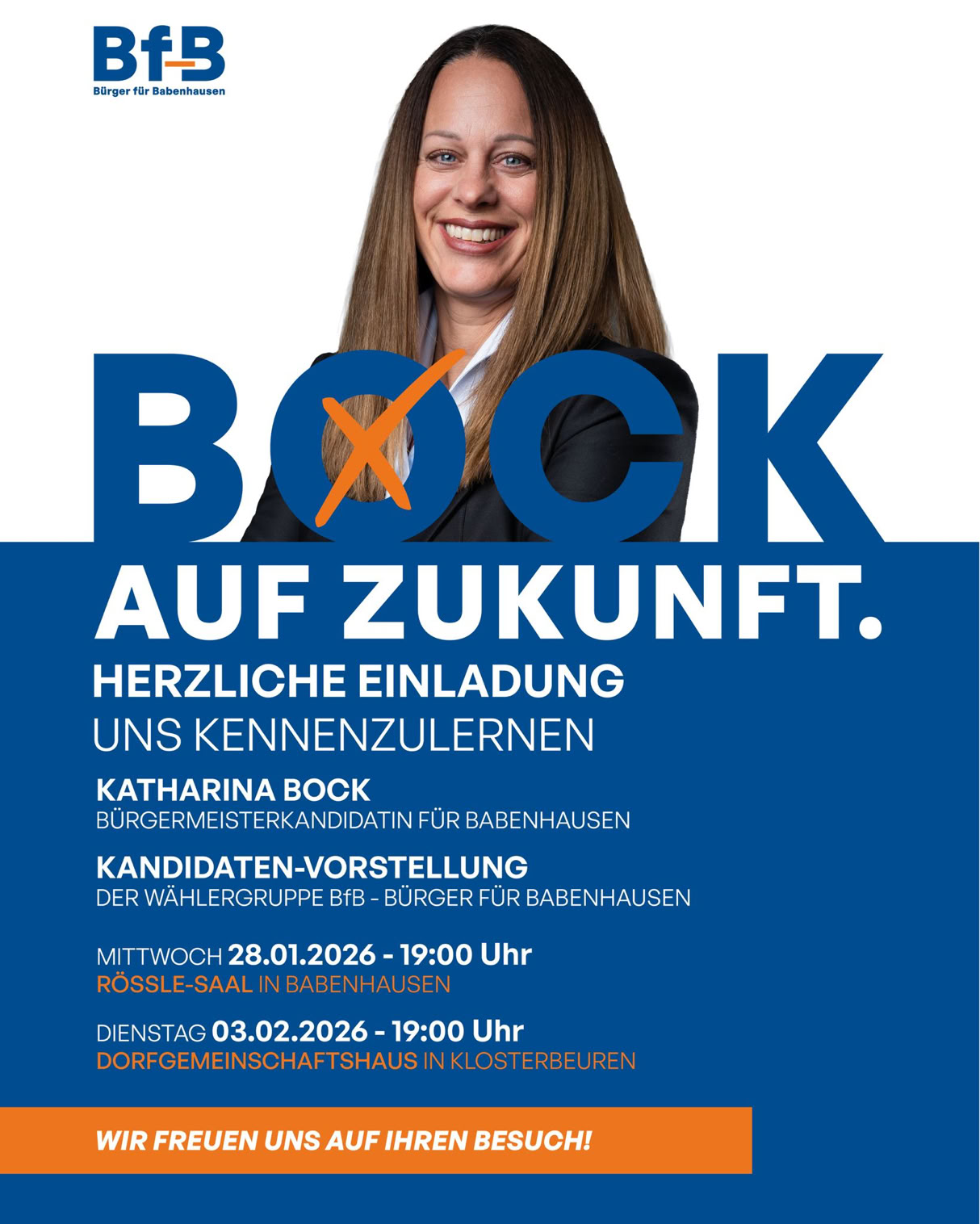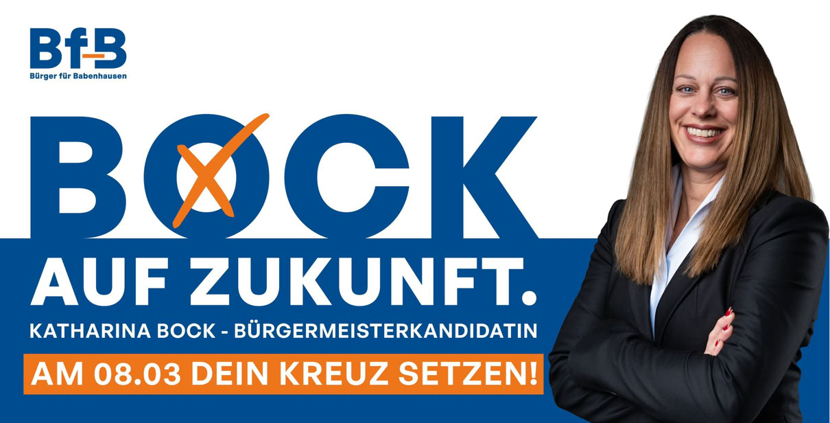 Katharina Bock kandidiert als Bürgermeisterin für die Wählergruppe Bürger für Babenhausen (BfB). Sie steht für eine bürgernahe, transparente Kommunalpolitik und möchte Babenhausen gemeinsam mit den Menschen vor Ort zukunftsorientiert weiterentwickeln.